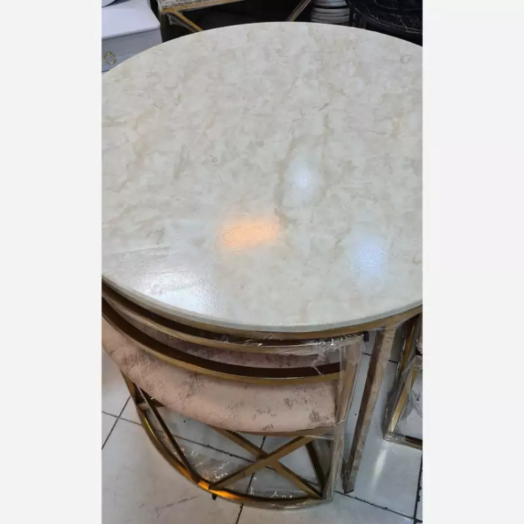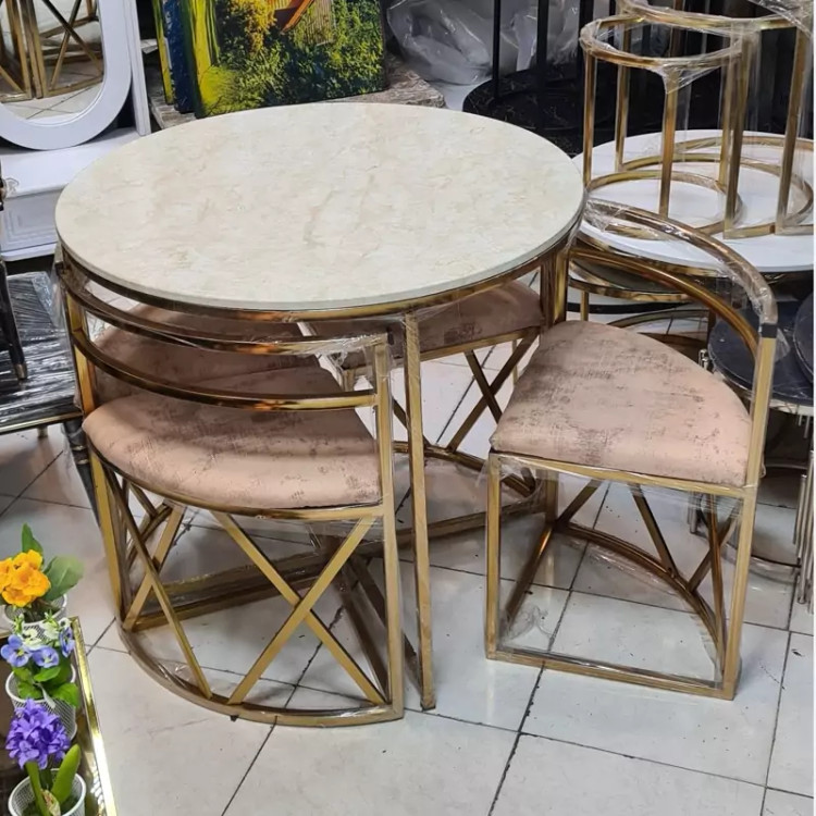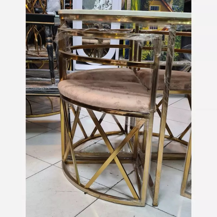 ناهارخوری کمجا 4نفره مدل فلزی ⭕️نکتهی مهم : این مدل کار شرکتی است و با کار های کارگاهی مقایسه نکنید🙏 🟢 جنس فلز: فورتیکه درجه یک ، به هیچ عنوان رنگ رفت ندارد 🟢نشیمن : 30 اسفنج کیلویی ویژه 🟢صفحه میز : MDF روکش وکیوم 🟢هم رنگ هم طرح صفحه قابل تغییره 🟢تنوع رنگی : طلایی ، نقره ای ، مشکی و... 🟢طرح پایین پایه ها هم تنوع داره و قابل تغییره 🟢پارچه : هر رنگ و مدل پارچه ای که مشتری عزیز انتخاب کند 🟢ابعاد: قطر صفحه میز 90 سانتیمتر 🟣برای تغییره فلز و پارچه 10 الی 14 روز کاری زمان لازمه 🟣هزینه پسکرایه و باربری و اسنپ به عهده مشتری عزیز میباشد🌹❤️ رضایت شما هدف ماست ✅️