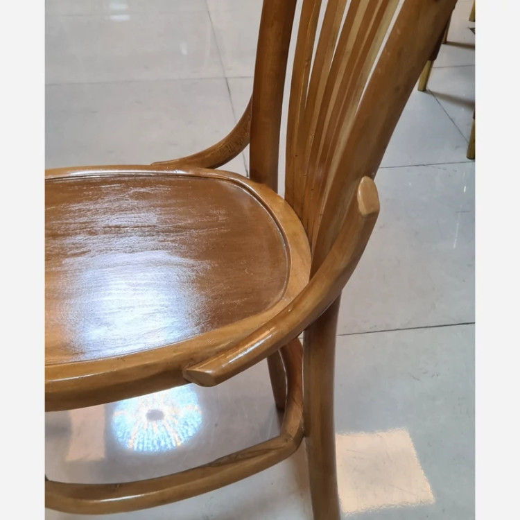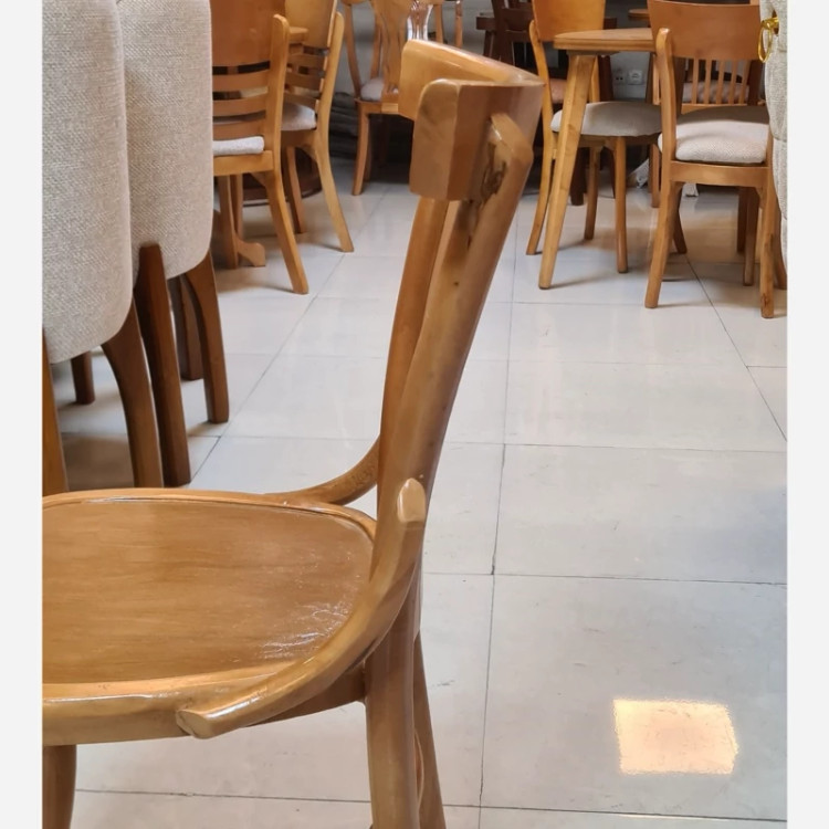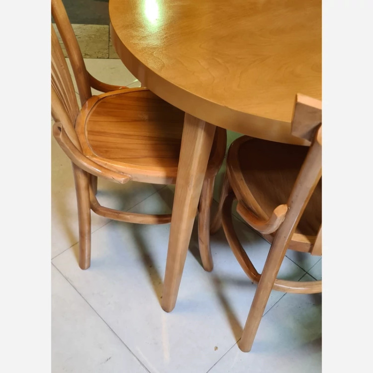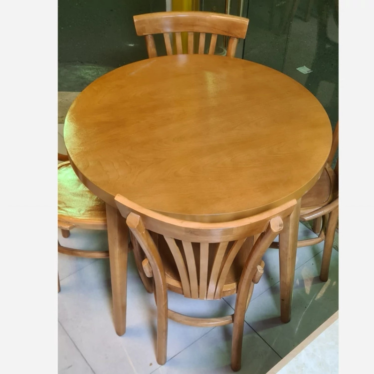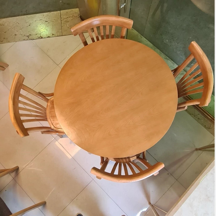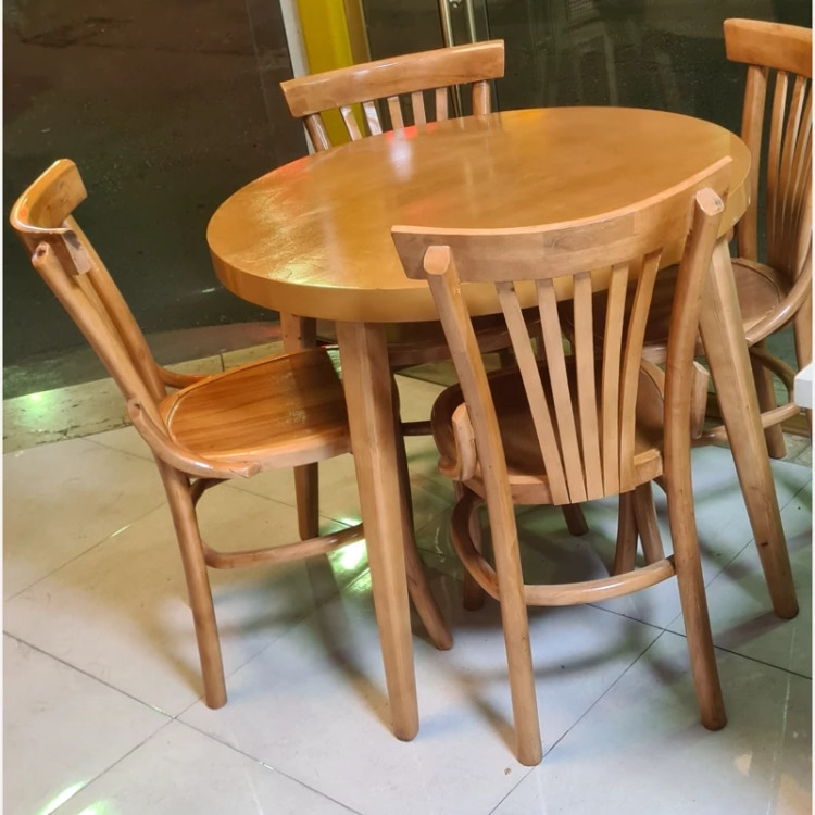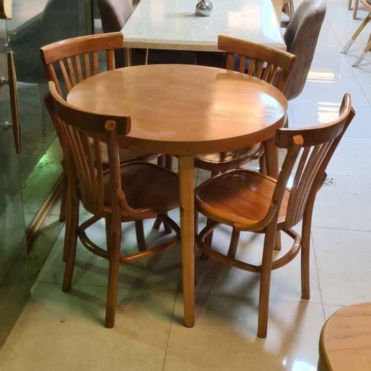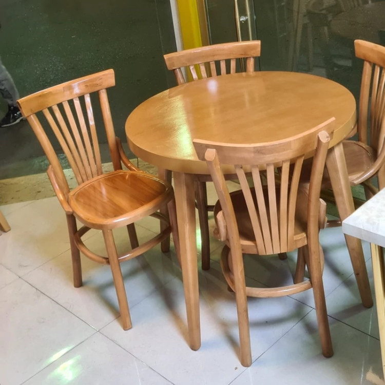 میز و صندلی ناهار خوری 4 نفره مدل لهستانی 5 تیرک ⭕️نکتهی مهم : این مدل کار شرکتی است و با کار های کارگاهی مقایسه نکنید🙏 🟢جنس صفحه میز: MDF روکش راش 🟢جنس پایه میز : چوبه روسی 🟢پایه میز به صورت پیچو مهره ای است و قابلیت بازو بسته شدن از صفحه را دارد 🟢ابعاد صفحه میز: قطر میز 90 سانتیمتر 🔴جنس چوبه صندلی: صددرصد چوبه توسکا 🔴رنگ چوب : فندقی تیره 🔴رنگ بندی چوب: فندقی تیره و فندقی روشن موجوده و رنگ های دیگه هم قابل سفارشه 🟣برای تغییره رنگه چوب 10 الی 14 روز کاری زمان لازمه 🟣هزینه پسکرایه و باربری و اسنپ به عهده مشتری عزیز میباشد🌹❤️ رضایت شما هدف ماست ✅️